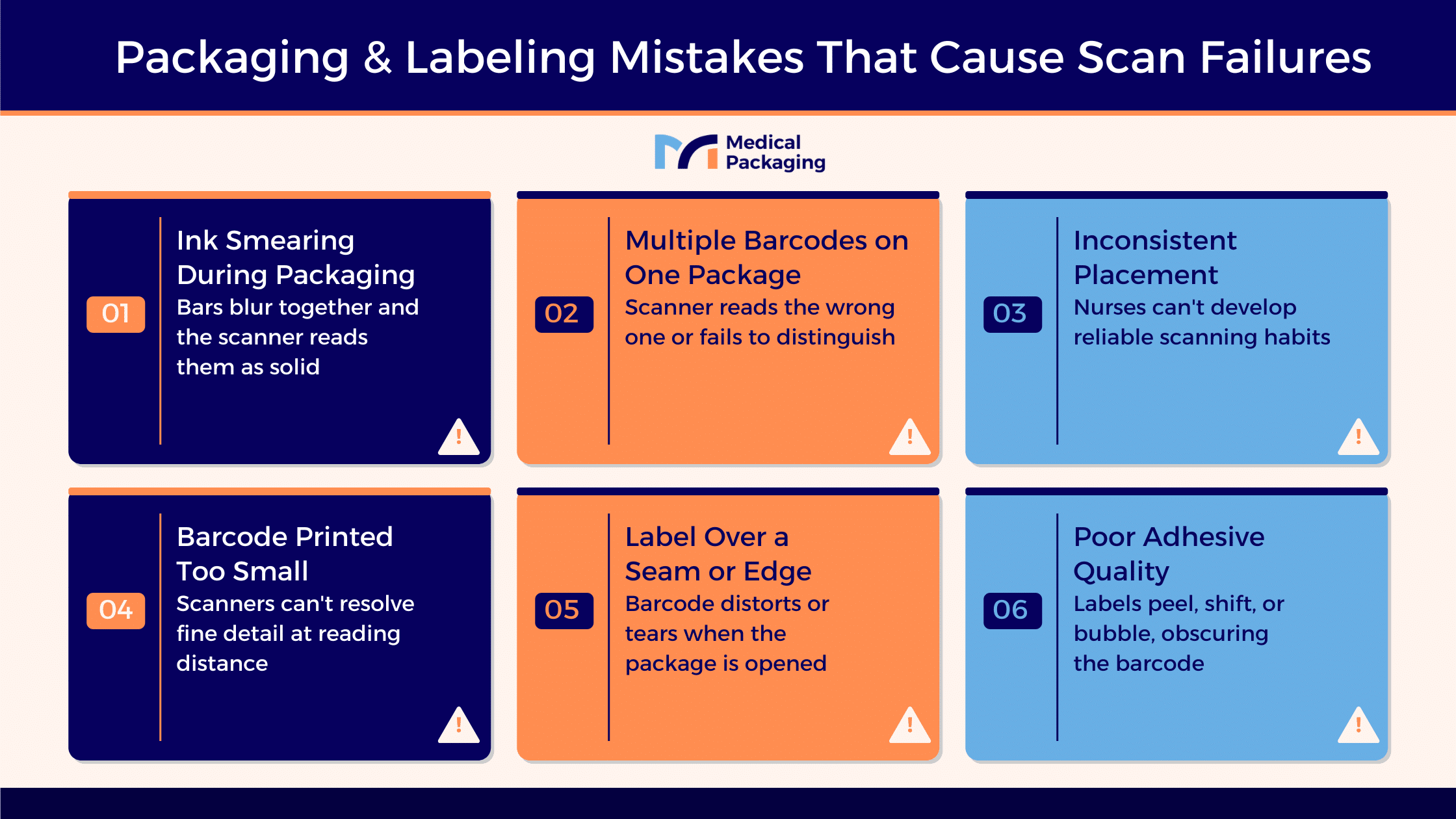 Most barcode scan failures in hospitals trace back to packaging and labeling issues: barcodes printed at too low a resolution, labels placed on curved or folded surfaces, low contrast between the barcode and the label background, or labels that have peeled or smeared during handling. Scanner hardware and user technique play a role too, but upstream packaging is often the root cause.