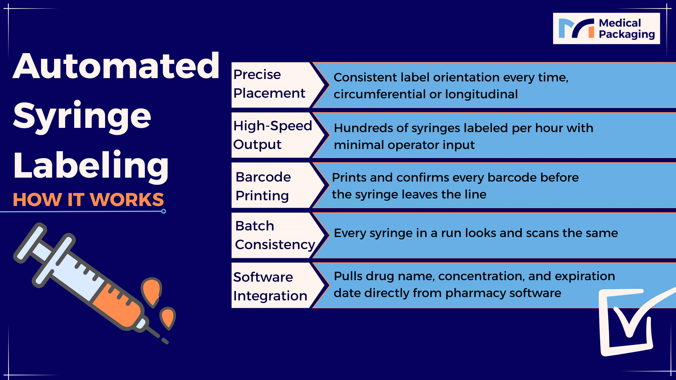 Labeling a syringe sounds simple: print a label, apply it, move on. But in a hospital pharmacy or drug manufacturing facility processing hundreds or thousands of syringes a day, that process is where serious medication errors can start. The wrong drug name, a misaligned barcode, or a label that falls off mid-shift are not minor inconveniences. They are patient safety risks. This blog breaks down how manual and automated syringe labeling compare on cost, consistency, and error reduction so you can make an informed decision for your operation.